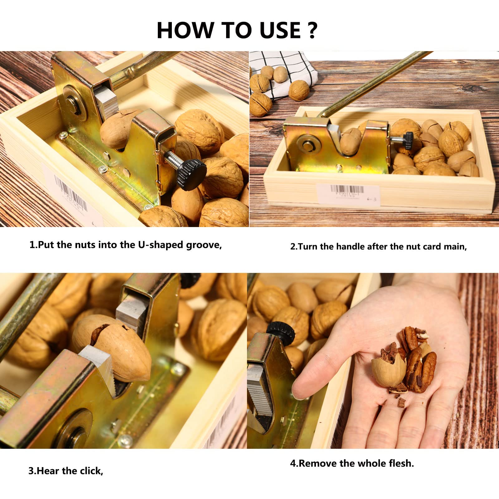 【HOW TO USE】 -- The first step is to put the nut into the U-shaped groove, the second step is to turn the handle after the nut is stuck, the third step is to hear a "click", and the fourth step is to take out the pulp completely.